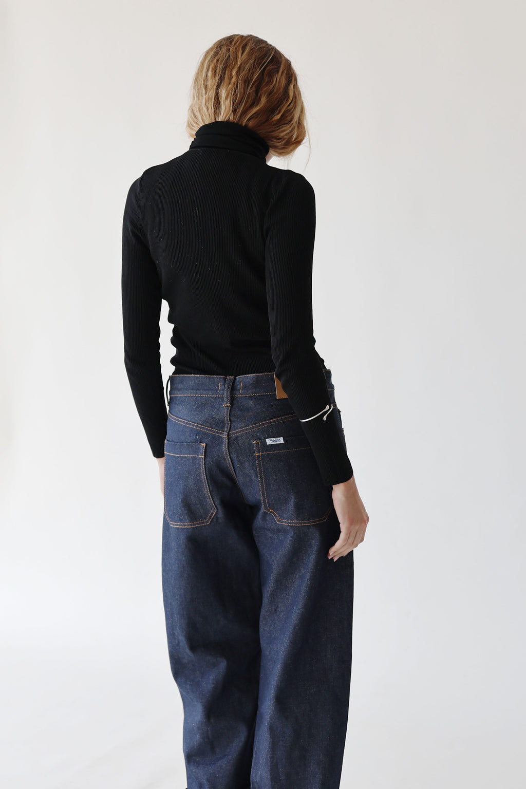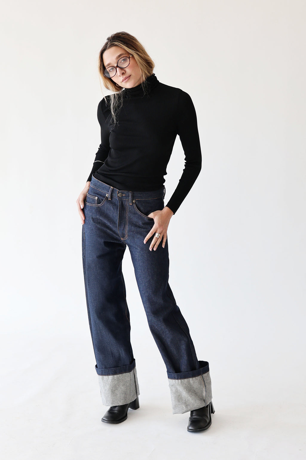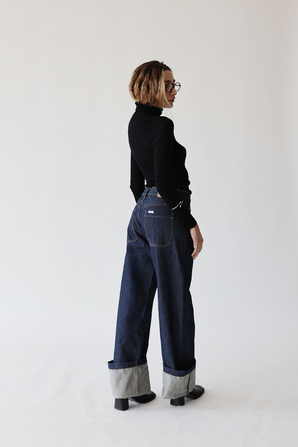 Jeans de corte recto y tiro medio-alto. Tiene un estilo oversize, con detalle de vuelta en el bajo. Diseño de cinco bolsillos, cintura con trabillas, cierre de cremallera y botón.